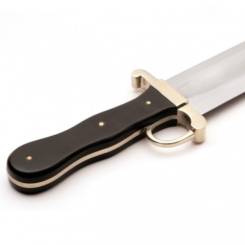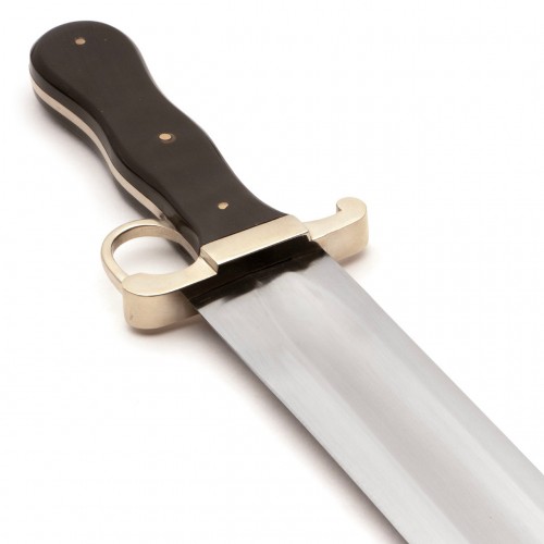• Esta réplica utiliza cuerno de búfalo negro y herrajes de plata niquelada. La hoja se ensancha ligeramente hacia la punta afilada para mayor potencia de corte. El borde superior de la hoja está afilado.