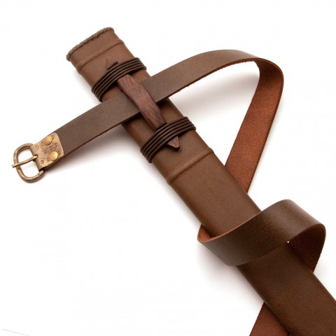 - Incluye vaina, elaborada con núcleo de madera y envuelta en cuero, e incluye un cinturón.