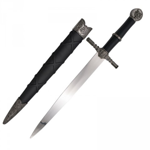 Daga Templaria con acabados color plata en pomo, cruceta y vaina.