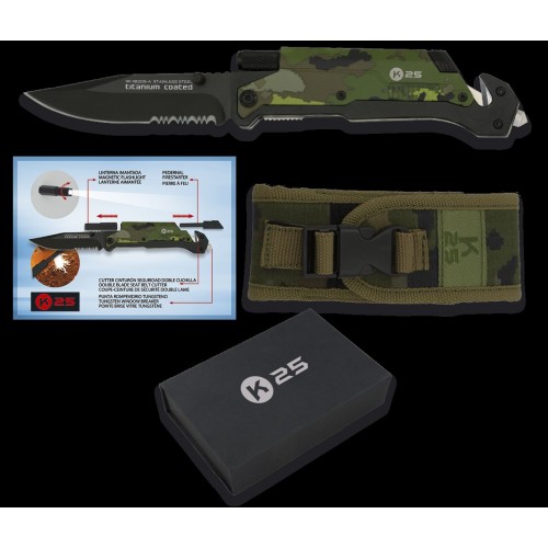 Navaja Táctica K25 con Pedernal y linterna 18205. Incluye además Cutter cinturón de seguridad, Punta rompevidrio y Clip. Mango de alumio Camo. Diseñado en España.