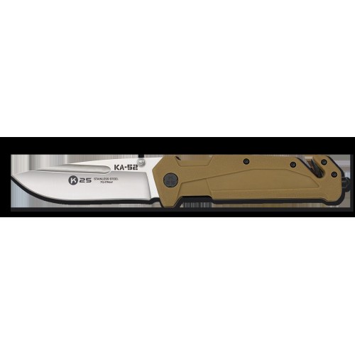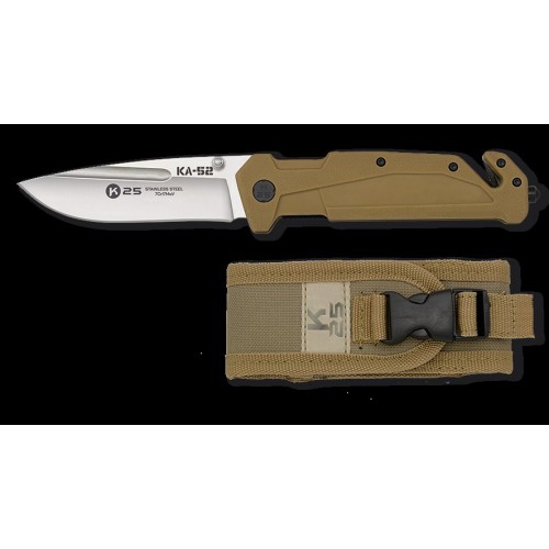 Navaja Táctica KA-52 de la marca K25.Tipo de Mango Goma Coyote. Con cortacinturón de doble cuchilla, tetón, fliper y Punta rompevidrio TUNGSTENO. Diseñado en Espàña.